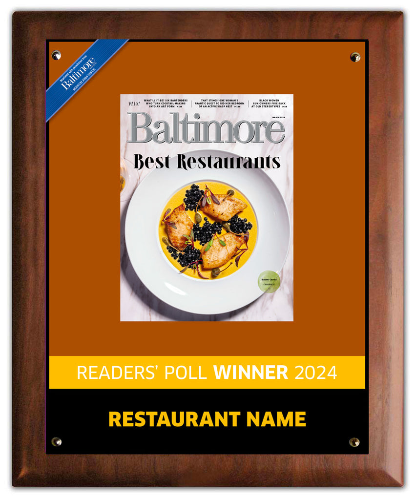 Celebrate this special occasion with a commemorative plaque, designed exclusively by the creative talent behind Baltimore magazine. For $250.00 you can purchase this exquisite, high-quality, modern black laminated plaque (11.5" x 14") or traditional walnut plaque (11" x 13") to prominently display the recognition of your elite distinction for years to come. Best of all, shipping is included!