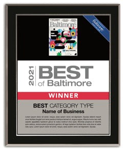 Celebrate this special occasion with a commemorative plaque, designed exclusively by the creative talent behind Baltimore magazine. For $250.00 you can purchase this exquisite, high-quality, modern black laminated plaque (11.5" x 14") to prominently display the recognition of your elite distinction for years to come. Best of all, shipping is included!
